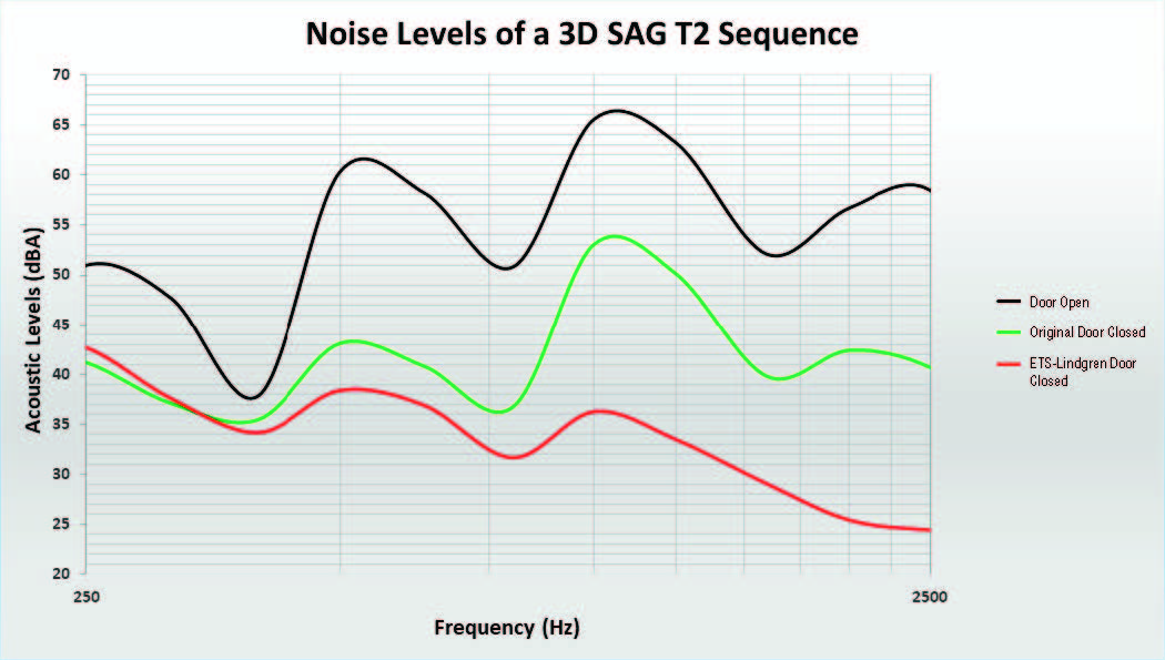 The specially developed acoustical seal design, core material, and overall weight aid in minimizing sound transmission while providing automatic RF sealing with minimal opening and closing forces. Prior to the door replacement at AdventHealth, ETS‑Lindgren conducted a thorough acoustic survey to document the existing STC rating of the MRI exam room. Once the new EVO Air Acoustic Door was installed, ETS‑Lindgren conducted a second acoustic survey to document the change in the acoustic performance. The “before” and “after” STC results along with the results with the door in the open position are shown in the graph below.
