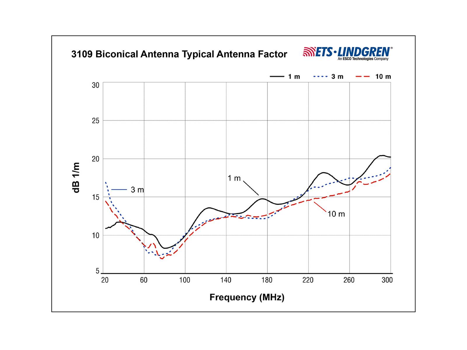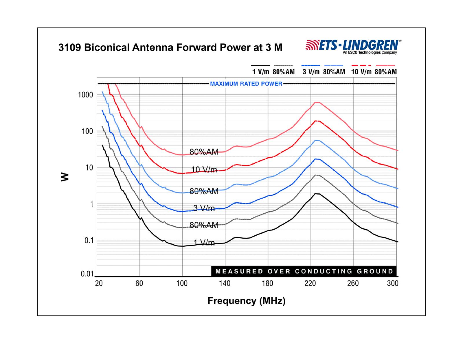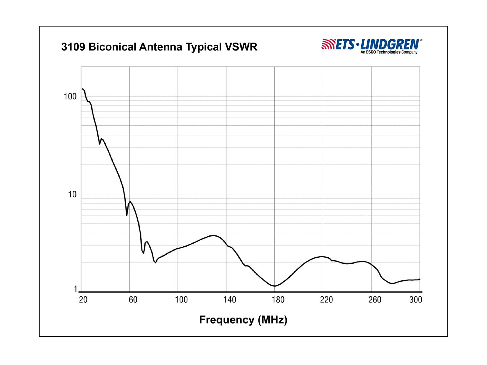While it typically has a high VSWR at frequencies below 70 MHz, the 3109 is still capable of generating a high field strength with acceptable input power in this region of the band. It is ideal for IEC 61000-4-3 testing.