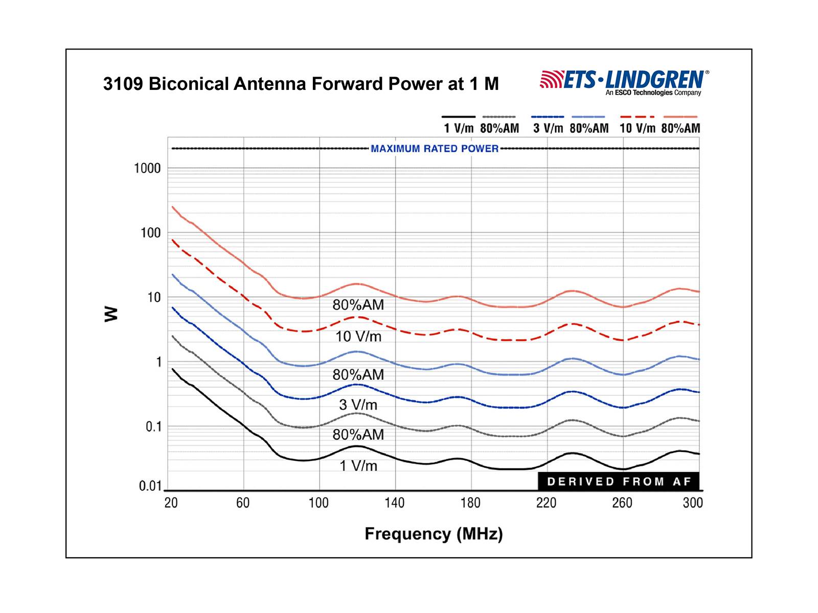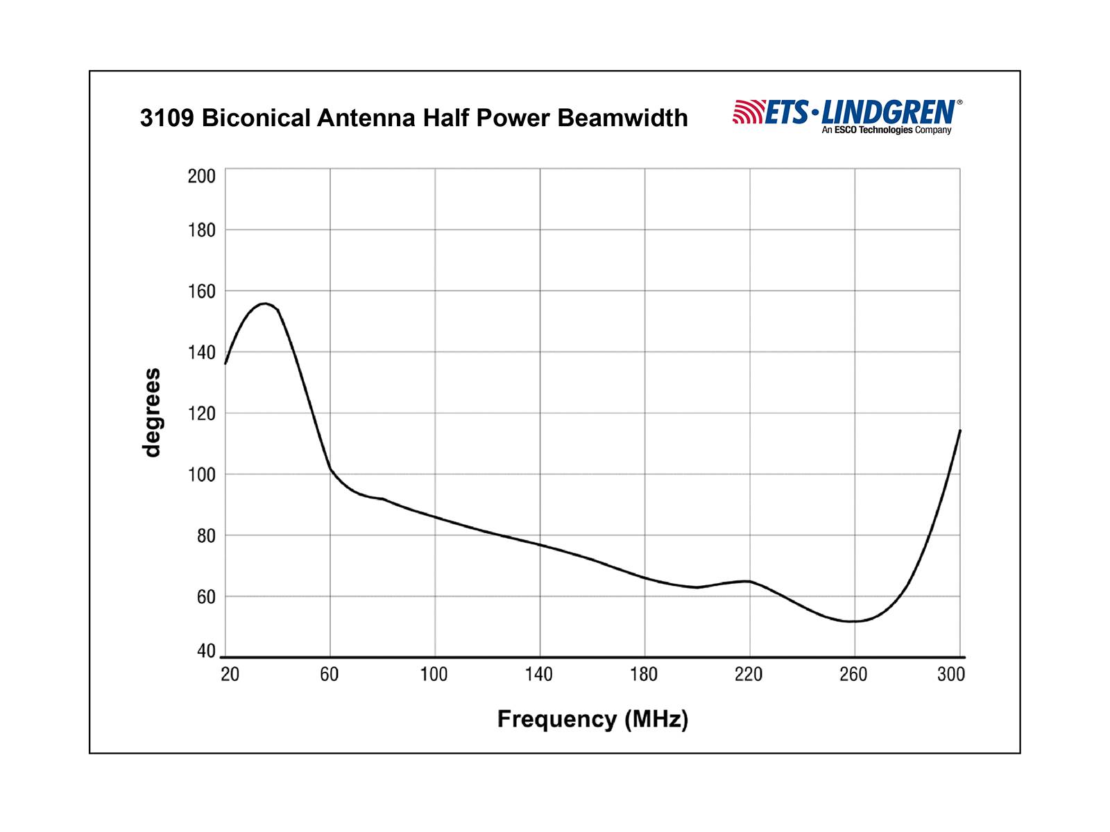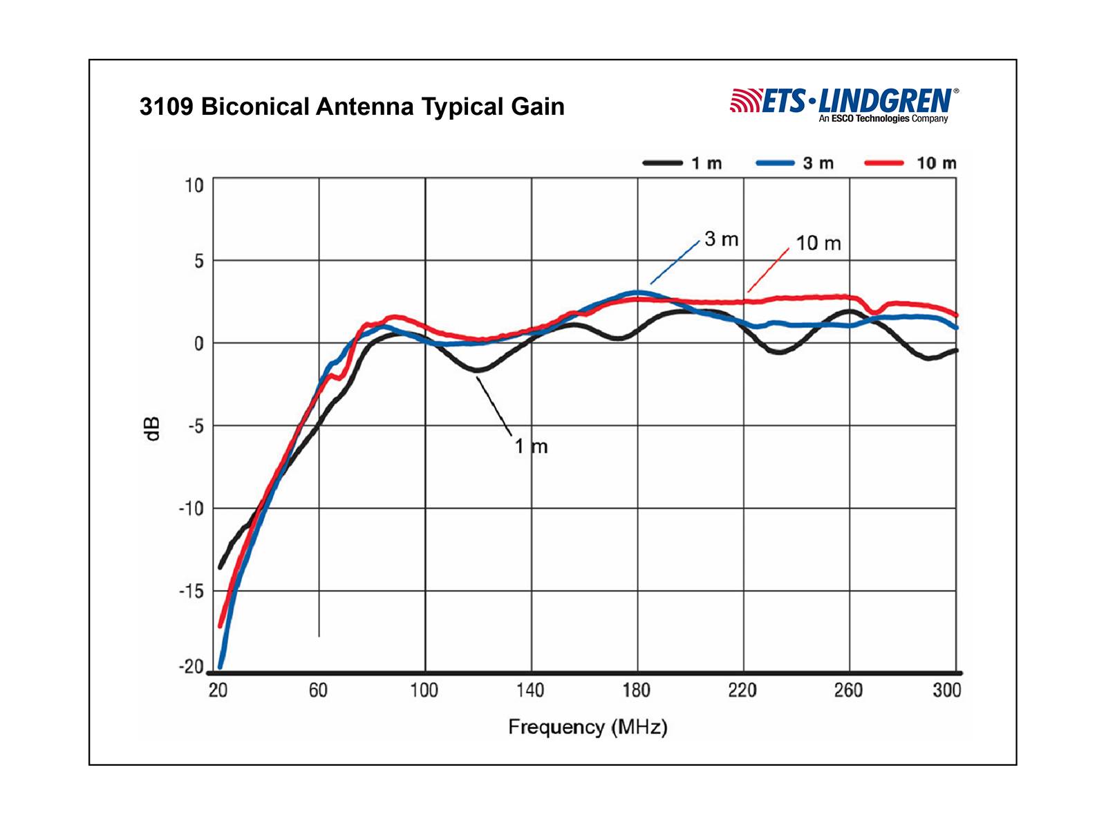 While it typically has a high VSWR at frequencies below 70 MHz, the 3109 is still capable of generating a high field strength with acceptable input power in this region of the band. It is ideal for IEC 61000-4-3 testing.