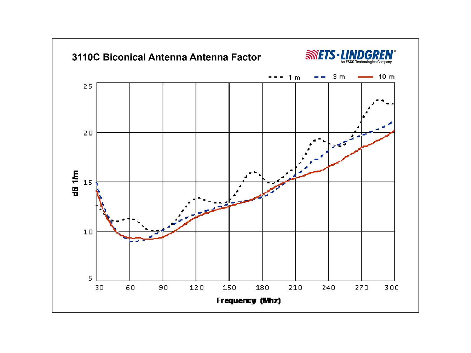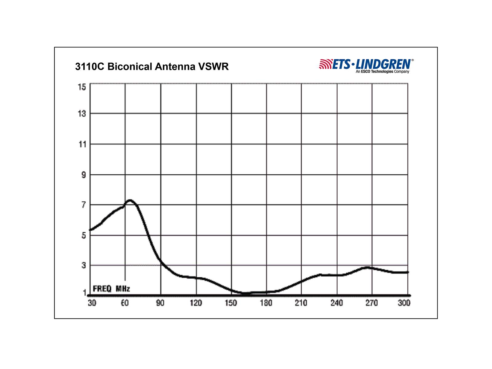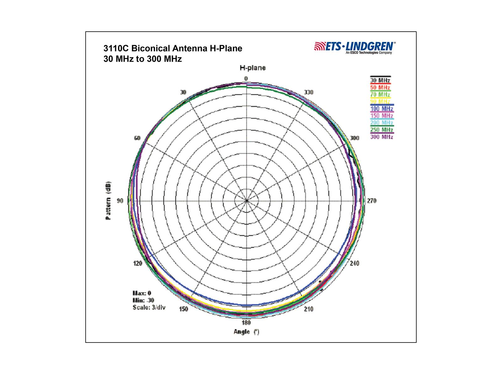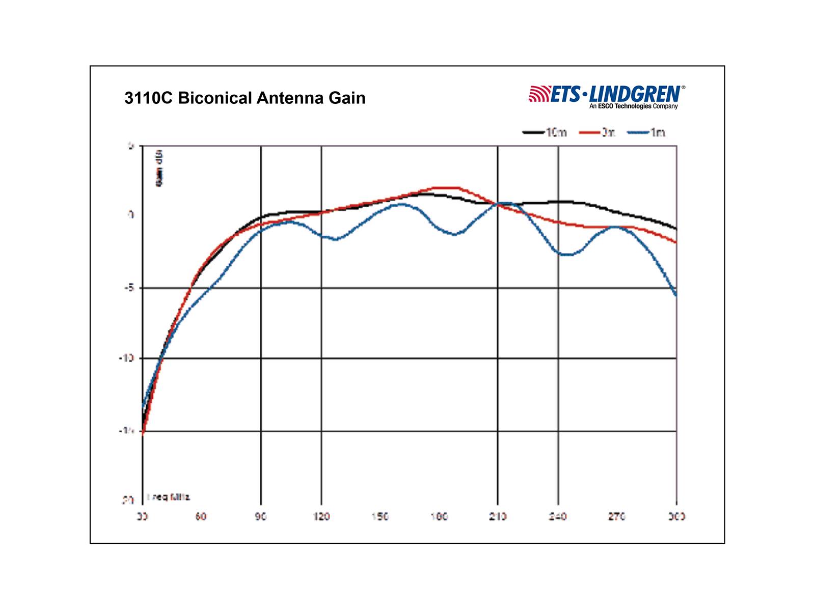 The 3110C Biconical Antenna combines several unique features to achieve high levels of performance: the balun, the feedline, and the elemental cage. These features give the model 3110C response curves that are almost linear, making it ideal for swept measurements. The 3110C is insensitive to orientation in the vertical plane, which eliminates unnoticed or unrecorded change in orientation that could change test results.