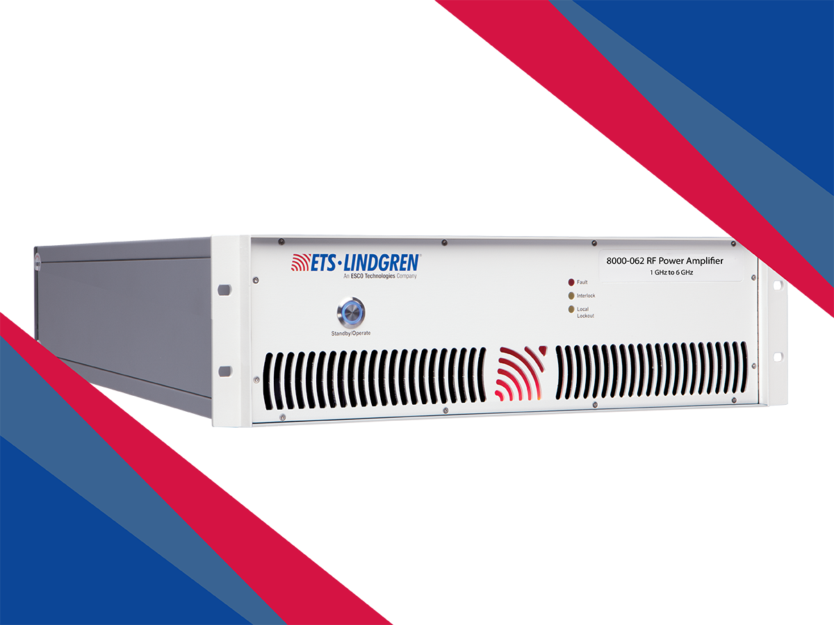 "The Model 8000-062 RF Power Amplifier delivers 125 watts of output power and is designed for EMC applications requiring IEC/EN 61000-4-3 radiated immunity testing up to 10 V/m (80% AM). Utilizing advanced GaN Class A technology, it provides exceptional linearity and efficiency while maintaining a rugged, high-reliability design suited for continuous operation in demanding test environments. Its wide operating frequency range from 1 GHz to 6 GHz supports modern commercial and industrial compliance requirements, including higher-frequency radiated testing. Very low distortion and 100% output mismatch tolerance ensure stable and accurate performance even under challenging load conditions. Dual coupled sample ports offer increased measurement flexibility and improved system monitoring capabilities. With its 4U rack-mount configuration and optional bench setup, the Model 8000-062 provides a powerful and versatile solution for high-frequency EMC laboratories.